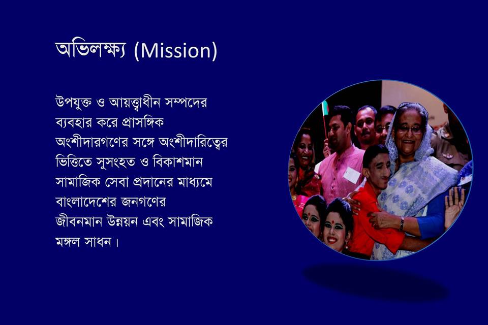 সামাজিক কল্যাণ, সুরক্ষা, ক্ষমতায়ন এবং উন্নয়নের মাধ্যমে বাংলাদেশের জনগণের জীবনমান উন্নয়ন।